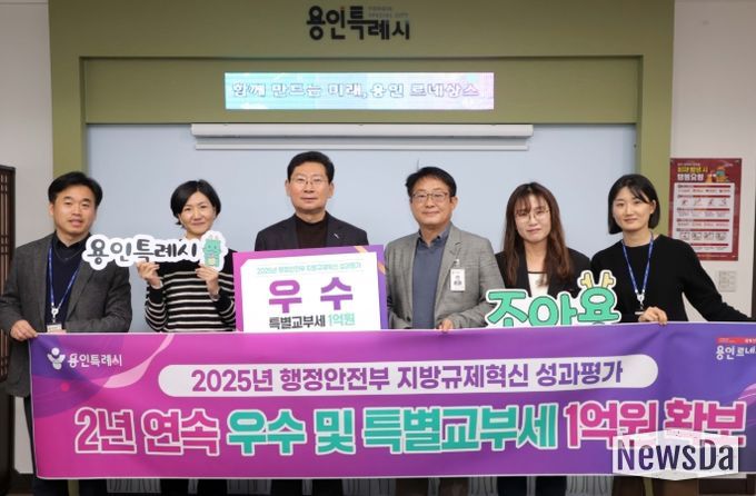 뉴스다 최광묵 기자 | 용인특례시는 지난해에 이어 ‘지방규제혁신 성과평가’에서 우수 기관으로 선정돼 특별교부세 1억 원을 확보했다고 16일 밝혔다.