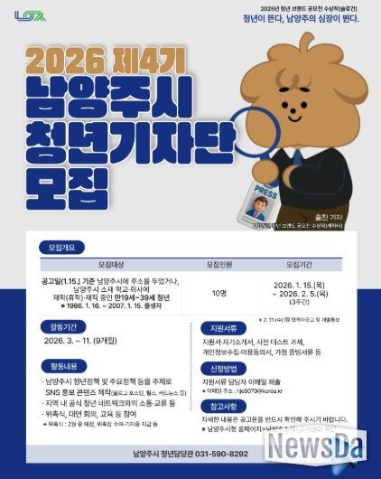 뉴스다 최광묵 기자 | 남양주시는 청년들과 소통을 강화하고 시정 참여를 확대하기 위해 1월 15일부터 2월 5일까지 ‘2026년 제4기 청년 기자단’을 모집한다고 밝혔다.