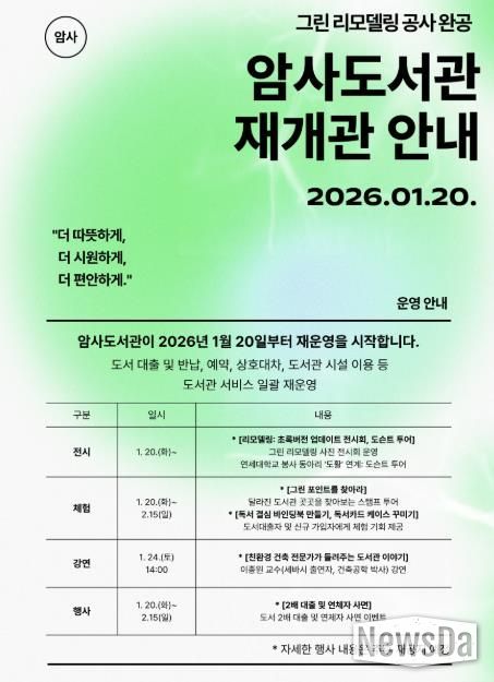 아울러 1월 24일에는 건축공학 전문가 이종원 교수를 초청해 ‘친환경 건축 전문가가 들려주는 도서관 이야기’ 특강을 열어 그린 리모델링의 가치를 구민들과 공유한다. 이밖에도 바인딩북·키링 만들기 체험과 도서 2배 대출, 연체자 사면 이벤트 등 책 읽기를 독려하는 다양한 행사가 마련된다.
