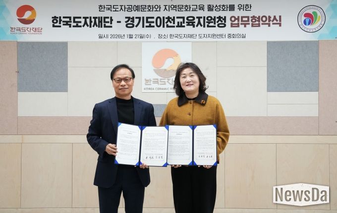 뉴스다 최광묵 기자 | 한국도자재단과 경기도이천교육지원청이 21일 한국도자재단 도자지원센터에서 도자공예문화 진흥과 지역문화교육 활성화를 위한 업무협약을 체결했다.