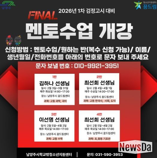 뉴스다 최광묵 기자 | 남양주시는 오는 2월 3일부터 남양주시학교밖청소년지원센터에서 학업을 중단한 청소년을 대상으로 ‘2026년도 제1회 검정고시 대비 학습 멘토링 프로그램’을 운영한다고 밝혔다.