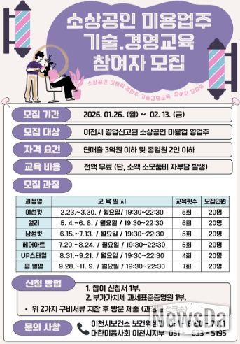 모집 기간은 2026년 1월 26일부터 2월 13일까지이며, 신청은 이천시보건소 보건위생과와 대한미용사회 이천시지부에서 할 수 있다.