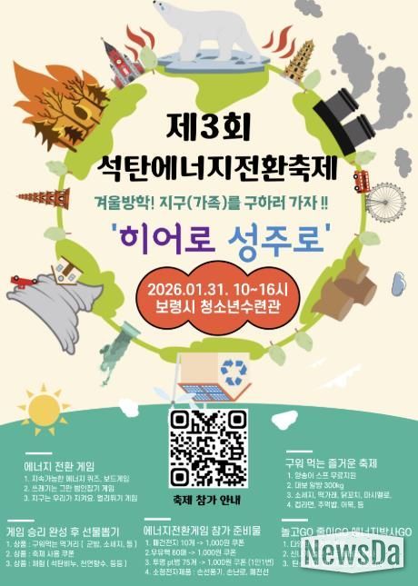 뉴스다 최광묵 기자 | 보령시가 주최하고 성주면 개화1리마을회가 주관하는 ‘제3회 겨울방학 석탄 에너지전환 축제’가 오는 1월 31일 오전 10시부터 오후 4시까지 보령시청소년수련원 일원에서 개최된다.