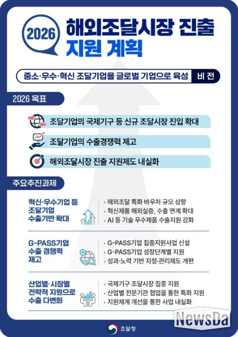 뉴스다 최광묵 기자 | 조달청은 중소 혁신·기술우수 조달 기업들이 글로벌 기업으로 도약할 수 있도록 '2026년 해외조달시장 진출 지원계획'을 확정하여, 해외조달시장 진출을 위한 지원을 대폭 강화한다고 밝혔다.