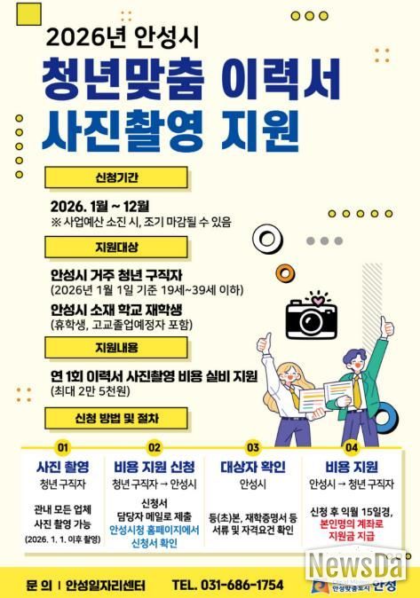 뉴스다 최광묵 기자 | 안성시는 관내 청년 구직자의 성공적인 취업을 지원하기 위해 ‘청년맞춤 이력서 사진 촬영’ 지원 사업을 시작한다.