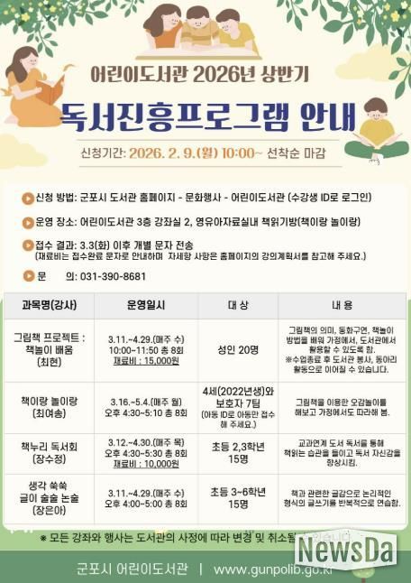 뉴스다 최광묵 기자 | 군포시 어린이도서관은 오는 3월부터 새학기를 맞은 어린이들이 책 읽기의 즐거움과 성취감을 느끼고 꾸준한 독서활동으로 기초 학력을 향상시킬 수 있도록 2026년 봄학기 독서 진흥프로그램을 운영한다고 밝혔다.