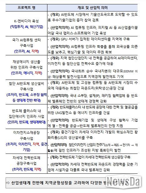 지난 12.19일 발표한 7건의 1차 메가프로젝트는 반도체 및 AI 등 첨단전략산업 및 그 생태계 발전에 파급효과가 큰 사업으로 서로 연계되어 시너지 효과를 낼 것으로 기대되며, 지역성장에 기여하는 등 산업적 의미가 큰 사업으로 구성되어 있다.