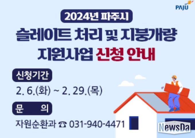 뉴스다 최광묵 기자 | 파주시는 노후 슬레이트 주택에 대한 시민건강 피해를 예방하고 쾌적한 생활환경을 조성하고자 2026년 슬레이트 철거 및 지붕개량 사업을 실시한다.
