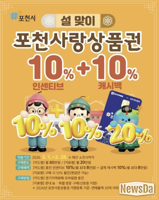 뉴스다 최광묵 기자 | 포천시는 설 명절을 맞아 지역 내 소비를 촉진하고 소상공인의 매출 증대를 지원하기 위해 포천사랑상품권을 확대 운영한다고 2일 밝혔다.