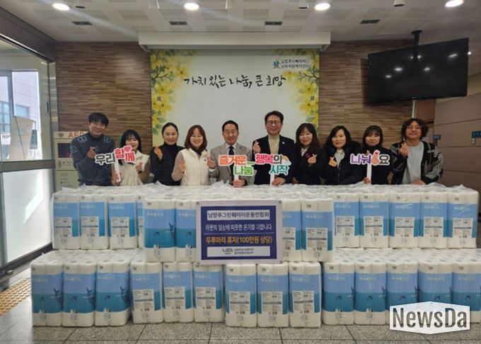 뉴스다 최광묵 기자 | 남양주시는 지난 29일 남양주그린훼밀리운동연합이 남부희망케어센터에 지역 내 취약계층 지원을 위한 100만 원 상당의 두루마리 휴지 81묶음(1묶음 30개입)를 전달했다고 2일 밝혔다.