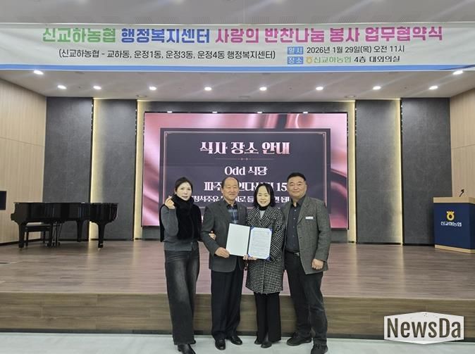 뉴스다 최광묵 기자 | 파주시 운정1동 지역사회보장협의체는 지난 29일, 신교하농협 4층 대강당에서 신교하농협 고향주부모임과 함께 취약계층 식생활 지원을 위한 반찬 나눔 업무협약을 체결했다.