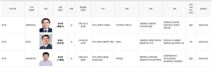 ▲경기도지사 예비후보자 2월 4일자 명부(사진제공=중앙선거관리위원회)