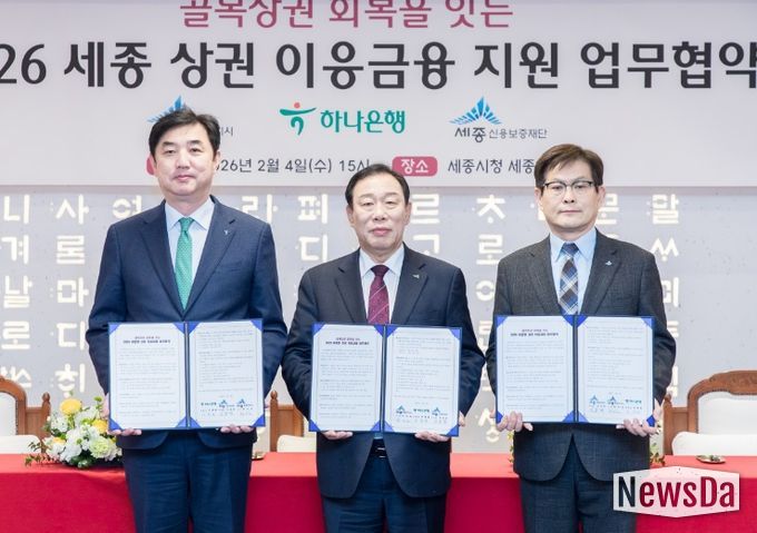 뉴스다 최광묵 기자 | 세종특별자치시가 4일 시청 세종실에서 하나은행, 세종신용보증재단과 ‘세종형 상권 이응금융 협약보증’ 업무협약을 체결했다.