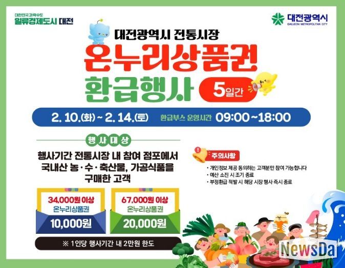 뉴스다 최광묵 기자 | 대전시는 10일부터 14일까지 총 5일 동안 설 연휴 소비 활성화와 지역경제를 살리기 위해 농림축산식품부, 해양수산부와 함께‘전통시장 온누리상품권 환급행사’를 진행한다.
