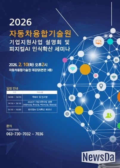뉴스다 최광묵 기자 | 전북특별자치도는 도내 자동차·뿌리·특장·항공산업 등 주력산업의 경쟁력 강화를 위해 오는 10일 자동차융합기술원에서 ‘2026년 기업지원사업 설명회 및 피지컬AI 산업 인식확산 세미나’를 개최한다고 5일 밝혔다.
