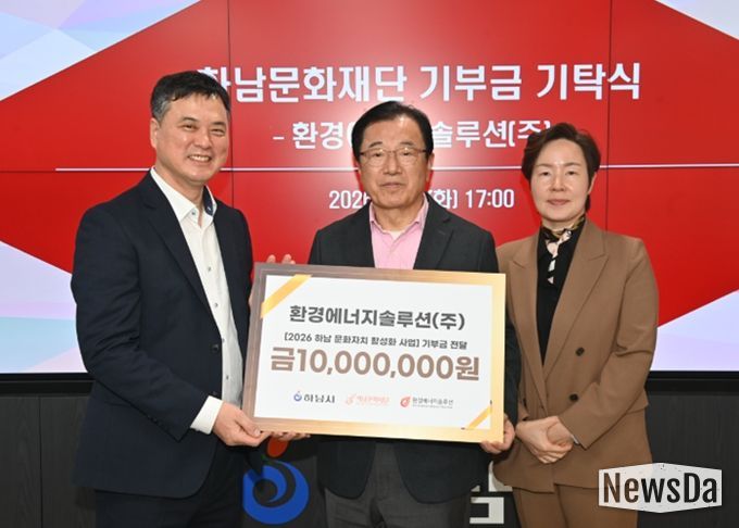 뉴스다 최광묵 기자 | (재)하남문화재단은 2월 4일, 하남시청에서 환경에너지솔루션㈜으로부터 문화자치 활성화를 위한 기부금 1천만 원을 전달받았다고 밝혔다. 이날 기부식에는 이현재 하남시장을 비롯해 기업 및 재단 관계자들이 참석해 지역 상생과 ESG 실천의 의미를 공유했다.