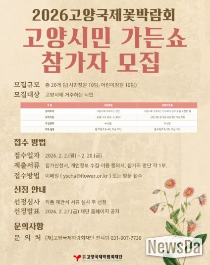 뉴스다 최광묵 기자 | (재)고양국제박람회재단이 오는 4월 24일 일산호수공원에서 개최되는 2026고양국제꽃박람회의 시민 참여 프로그램 ‘고양시민 가든쇼’의 참가자를 이달 20일까지 모집한다.