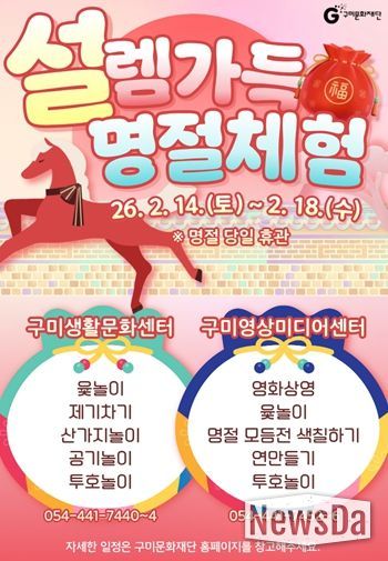 뉴스다 최광묵 기자 | (재)구미문화재단은 다가오는 설 연휴(2. 14. ~ 18.)를 맞아 구미생활문화센터와 구미영상미디어센터에서 시민과 귀성객을 위한 다채로운 문화 향유 프로그램을 운영한다고 밝혔다.