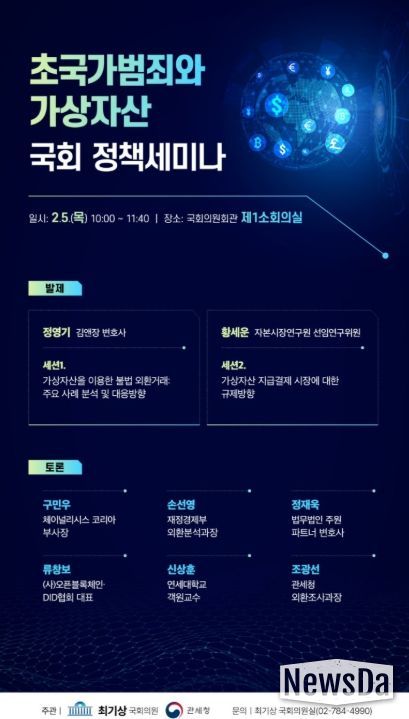 뉴스다 최광묵 기자 | 관세청은 최기상 국회의원(더불어민주당·서울 금천구)과 공동으로 2월 5일 국회 의원회관에서 '초국가범죄와 가상자산: 국경을 넘어선 불법 자금 흐름 대응' 국회 정책 세미나를 개최했다.