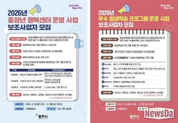 이번 공개모집은 ▲중장년 행복센터 운영사업 ▲우수 평생학습 프로그램 지원사업 등 2개 사업을 대상으로 한다. 모집 기간은 2월 9일부터 20일까지이며 신청 대상은 비영리 법인·단체와 학교 등이다.
