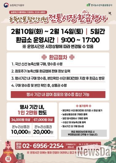 백은정 경제정책과장은 “설 명절을 맞아 전통시장을 찾는 소비자들의 장바구니 물가 부담을 덜어주는 계기가 되길 바란다”며 “이번 행사가 전통시장 이용 확대와 지역 경제 활성화로 이어지길 기대한다”고 말했다.