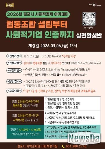 뉴스다 최광묵 기자 | 김포시가 사회문제 해결을 위한 참신한 아이디어와 실행력을 갖춘 사회적경제기업 육성을 위해 ‘2026년 김포시 사회적경제 아카데미’를 개설하고, 오는 3월 3일까지 수강생을 모집한다.