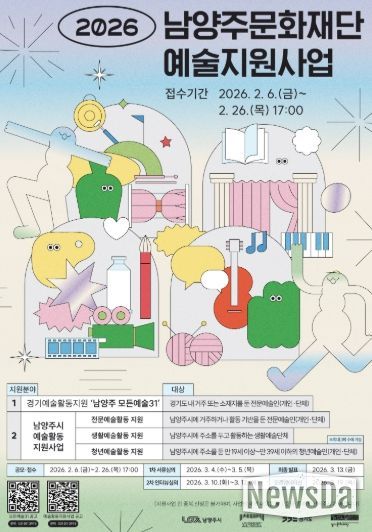 뉴스다 최광묵 기자 | 남양주시는 6일 남양주문화재단이 지역 예술인의 안정적인 창작 환경 조성과 시민 문화향유 기회 확대를 위해 ‘2026년 예술활동 지원사업 공모’를 추진하고, 오는 26일까지 접수를 진행한다고 밝혔다.