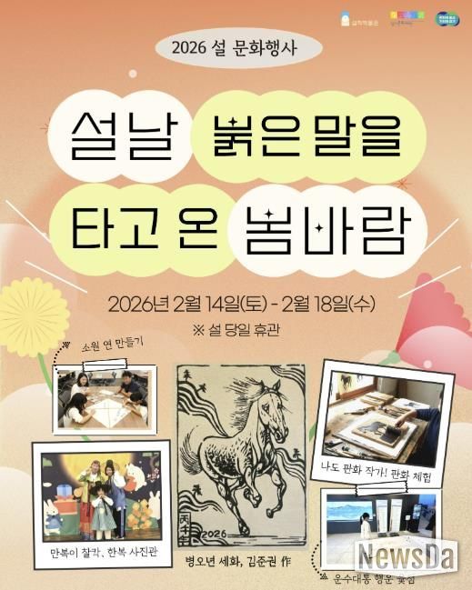 뉴스다 최광묵 기자 | 경기문화재단 실학박물관은 2026년 병오년(丙午年) 설 명절을 맞아 오는 2월 14일부터 18일까지 문화 행사 '설날, 붉은 말을 타고 온 봄바람'을 운영한다. 이번 행사는 박물관 로비에 마련된 체험 부스에서 진행되며, 실학박물관을 찾는 가족 단위 관람객을 위해 전통 세시풍속을 현대적인 놀이와 체험으로 재해석하여 관람객에게 특별한 추억을 선사할 예정이다.
