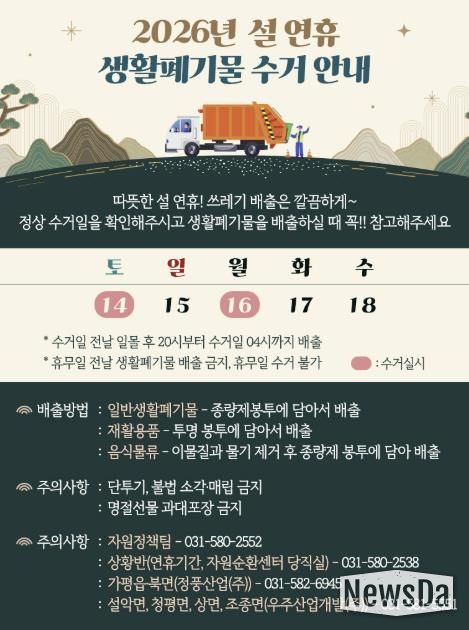 뉴스다 최광묵 기자 | 가평군은 설 명절을 맞아 군민과 방문객 모두가 쾌적한 환경에서 청결한 연휴를 보낼 수 있도록 생활폐기물 처리 대책을 마련했다.
