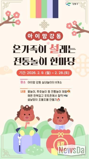 뉴스다 최광묵 기자 | 서울 강동구는 다가오는 설 명절을 맞아 관내 ‘아이맘 강동’ 8개소 실내놀이터에서 아이와 가족이 함께 즐길 수 있는 전통문화 체험 프로그램을 운영한다고 10일 밝혔다.