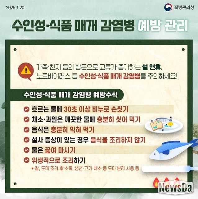 겨울철에 주로 발생하는 노로바이러스 감염증이 최근 영유아(0~6세)와 학생을 중심으로 지속적으로 발생하고 있어 각별한 주의가 요구된다. 노로바이러스는 오염된 음식물뿐만 아니라 환자와의 접촉, 비말 등을 통해서도 전파될 수 있어 많은 사람이 모이는 명절에 확산 위험이 더 높아진다. 파주보건소는 관내 어린이집, 사회복지시설 등 감염 취약시설에 예방수칙 안내문을 배포하고, 위생 관리를 철저히 해줄 것을 당부했다.