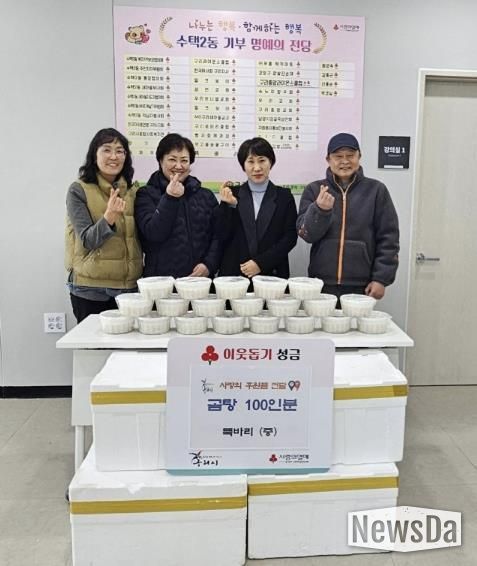 뉴스다 최광묵 기자 | 구리시 수택2동 행정복지센터는 지난 2월 9일, 지역 음식점 뚝바리로부터 설 명절을 맞아 설렁탕 100인분을 후원받아 관내 저소득 취약계층에 전달했다고 밝혔다.
