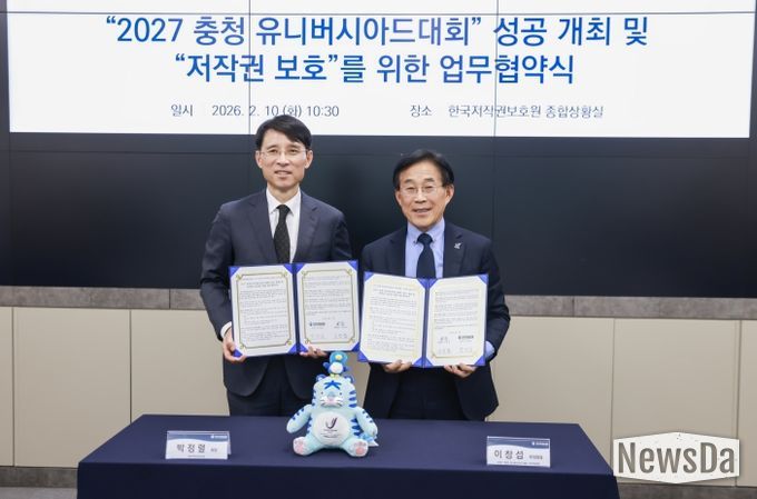 뉴스다 류대현 기자 | 2027 충청 유니버시아드대회 조직위원회는 10일 서울 상암동 한국저작권보호원에서 대회 콘텐츠 저작권 보호를 위한 업무협약을 체결했다고 밝혔다.