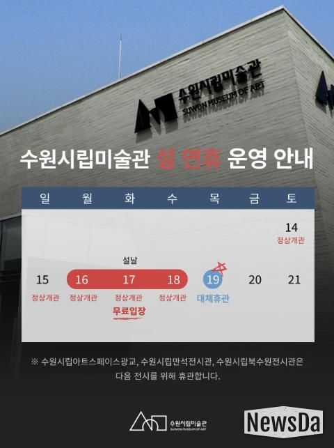 뉴스다 최광묵 기자 | 경기도 수원시립미술관은 설 연휴를 맞아 고향을 찾은 방문객 및 시민들의 풍요로운 여가생활을 위해 설 연휴 기간 정상 개관 및 설 당일 무료 관람을 실시한다.