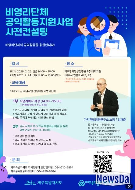 김인영 제주도 특별자치행정국장은 “이번 공모를 통해 다양한 민간단체의 공익활동이 지역사회 곳곳에서 활발히 이뤄지길 기대한다”며 “앞으로도 민간과 협력하는 공익 기반을 지속적으로 확대해 나가겠다”고 말했다.