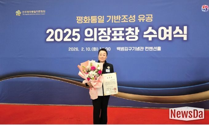 뉴스다 최광묵 기자 | 정임행 민주평화통일자문회의 강남구협의회 차석(㈜파모소 회장)이 2026년 2월 10일 오후 2시 서울 용산구 백범김구기념관 컨벤션홀에서 개최된 민주평화통일자문회의 2025 의장표창 수여식(서울지역)에서 민주평화통일자문회의 의장 대통령 표창을 수상했다.
