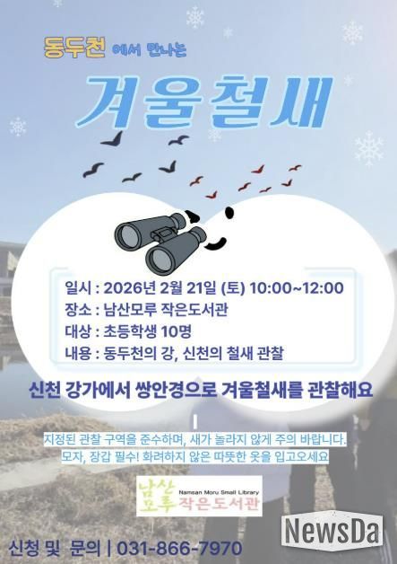 뉴스다 최광묵 기자 | 동두천시 남산모루 작은도서관은 오는 2월 21일 오전 10시부터 정오까지 도서관 인근 신천에서 겨울 철새 관찰 프로그램을 운영한다.