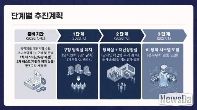 시는 올해 상반기를 사전 준비 기간으로 정하고, 8개 부서가 참여하는 AI 당직 전담조직(TF)을 구성하고 시·구청 당직 통합 시 근무량을 검증했다. 다음 달에는 구청 당직 폐지 시 예상되는 시민 불편과 사각지대를 시뮬레이션 방식으로 점검하고, 5월까지 조례·규칙 개정과 법제 심사를 마쳐 제도적 기반을 마련할 예정이다.