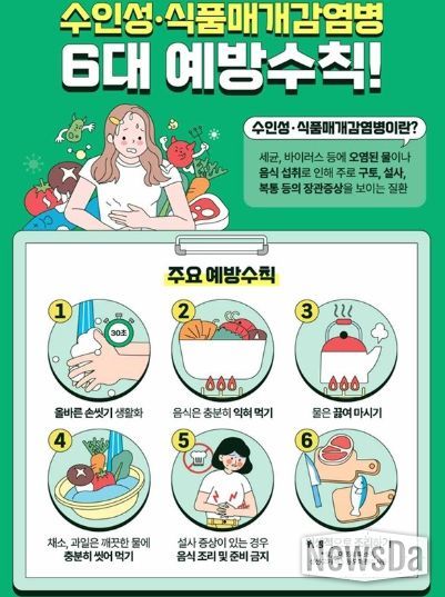 또한, 노로바이러스와 같은 수인성‧식품매개 감염병은 개인위생 준수와 식품 조리 시 위생적인 조리를 통해서 예방할 수 있다. 예방수칙으로는 ▲흐르는 물에 30초 이상 비누로 손씻기 ▲음식은 충분히 익혀 먹기 ▲ 채소, 과일은 깨끗한 물에 씻거나 껍질 벗겨 먹기 ▲ 설사 증상이 있는 경우 음식 조리 및 준비하지 않기 등이 있다.