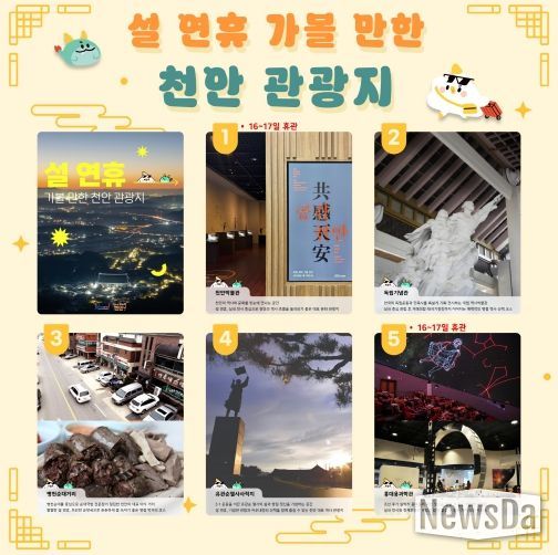이계자 관광과장은 “설 연휴 동안 천안에서 알찬 하루 여행이 가능하도록 대표 관광지를 연계했다”며 “가족과 함께 천안의 역사와 문화를 체험하며 따뜻한 명절 추억을 만들길 바란다”고 말했다.