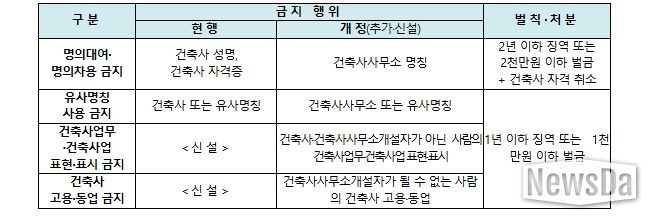 이에 따라, 건축사사무소 명의대여 등에 대한 금지 규정을 마련하고 위반 시 처벌할 수 있는 근거를 신설했다.