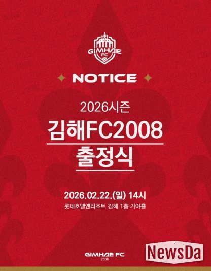 뉴스다 류대현 기자 | K리그2 무대에 첫 도전장을 내미는 김해FC2008(이하 김해FC)이 오는 22일 오후 2시, 롯데호텔앤리조트 김해에서 ‘2026시즌 출정식’을 개최한다.