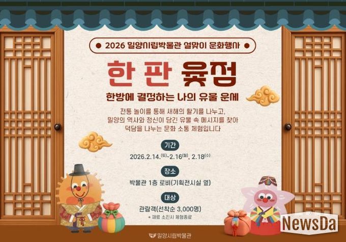 뉴스다 최광묵 기자 | 경남 밀양시립박물관은 2026년 설 명절을 맞아 시민과 관람객들이 전통문화를 즐기며 화합할 수 있는 ‘설맞이 특별 체험 프로그램’을 운영한다.