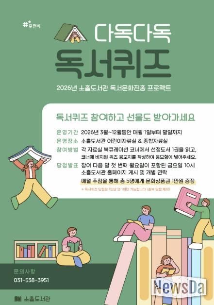 뉴스다 최광묵 기자 | 포천시립소흘도서관은 독서 생활화와 지역사회 독서문화 확산을 위해 오는 3월부터 어린이, 청소년·일반을 대상으로 대상으로 ‘다독다독 독서퀴즈’를 운영한다.