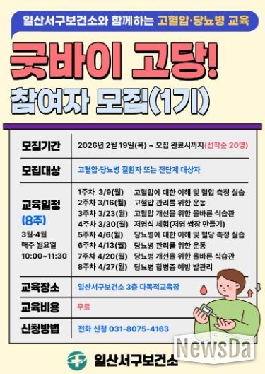 뉴스다 최광묵 기자 | 고양특례시 일산서구보건소는 지역주민의 고혈압·당뇨병 예방관리를 위해 2026년 ‘굿바이 고당! 교실’에 참여할 1기 참여자를 오는 19일부터 모집한다.