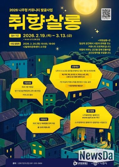재단은 시민 주도의 생활문화를 활성화하고 지역 기반 커뮤니티를 발굴 및 육성하기 위해 2026 나주형 커뮤니티 발굴사업 ‘취향살롱’에 참여할 공간운영자를 오는 3월 13일까지 모집한다고 13일 밝혔다.