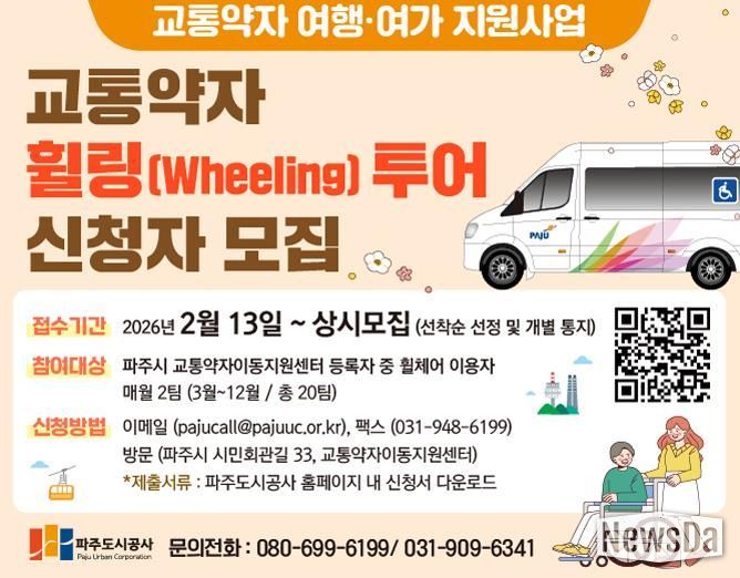 뉴스다 최광묵 기자 | 파주시 교통약자이동지원센터는 교통약자의 이동권 확대와 여가 활동 증진을 위해 '교통약자 휠링(Wheeling) 투어 지원사업'을 3월부터 본격 운영한다고 밝혔다.