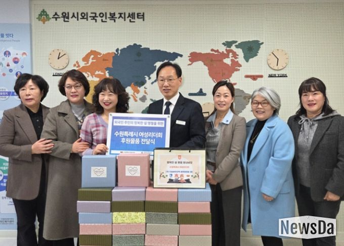 뉴스다 최광묵 기자 | 수원시여성리더회가 “경제적·정서적 어려움을 겪는 외국인들에게 전달해 달라”며 600만 원 상당의 화장품 선물세트(스킨·로션·크림 3종)를 수원시에 전달했다.