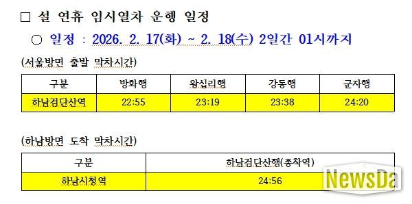 하남시 관계자는 “설 명절을 맞아 고향을 찾은 귀성객들이 교통수단 걱정 없이 가족과 따뜻한 시간을 보낼 수 있도록 이번 연장 운행을 결정했다”며, “역사별로 막차 시간이 다를 수 있으니 하남시청 및 서울교통공사 홈페이지, 각 역사의 게시판을 통해 열차 시간표를 미리 확인해 주시길 바란다”고 당부했다.