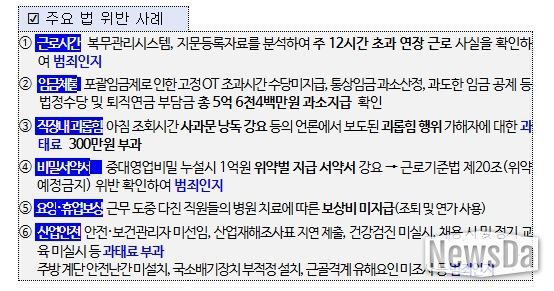 이와 함께 연장·야간·휴일근로 수당 등 임금 미지급 5억 6천4백만원에 대해서도 시정지시했다.